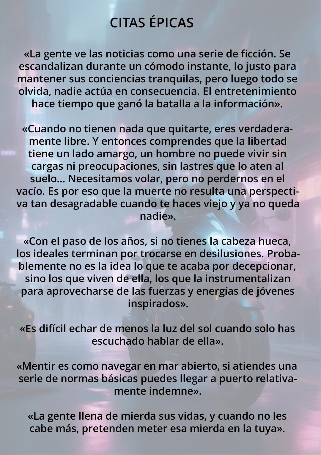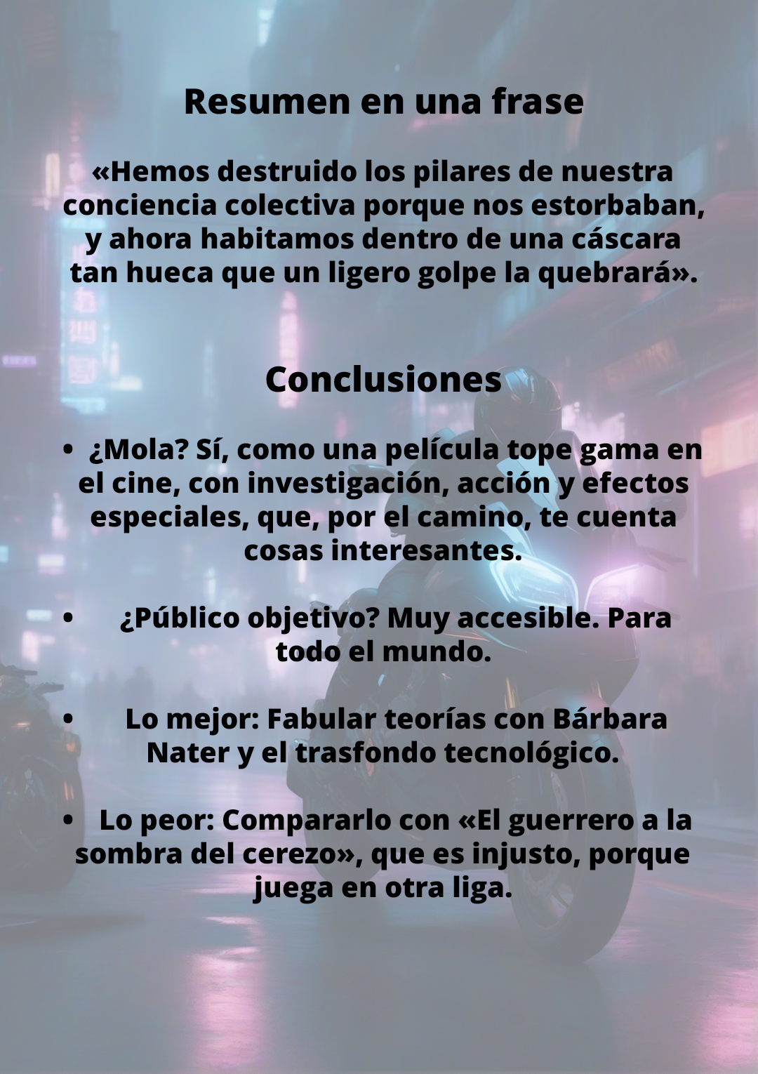 Sí es cierto que un par de escenas me han parecido demasiado forzadas, como de película palomitera, y que el final, a pesar de dejar las tramas cerradas, se me antoja algo abrupto. Me hubiera gustado saber más de algunos personajes y conceptos.