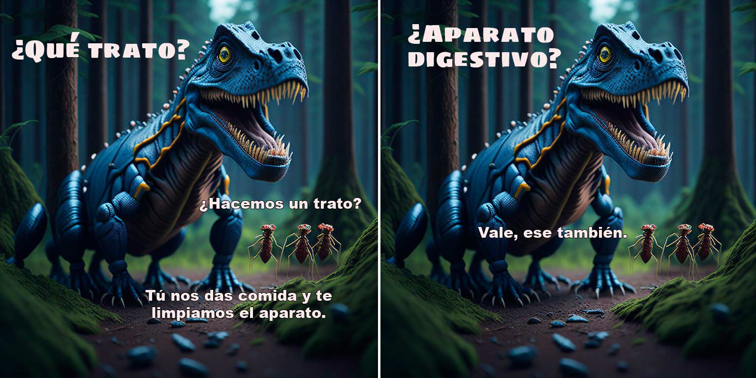 Pues lo típico que iba una hormiga por el bosque y decidió meterse en la boca de un tiranosaurio a buscar comida, que ya hay que manejar hambre. Se ve que al dinosaurio le pareció bien, porque tenía trozos de pterodáctilo fermentando, y de esa manera tan tonta se formó la primera clínica dental de la historia.